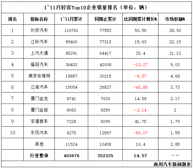 从各个厂商的具体表现来看,1~11月,Top10企业“5增5降”,5家正增长的企业分别是:长安汽车、宇通客车、上汽大通、江铃汽车、厦门金龙,其中,排名第一的长安汽车以50.56%的增幅领涨Top10。在行业整体增长14.57%的背景下,5家正增长的企业均跑赢了行业。5家同比负增长的企业中,东风汽车降幅最大,达到50.07%。