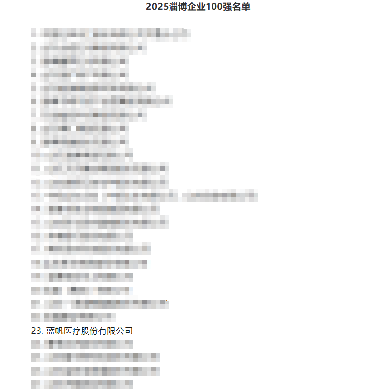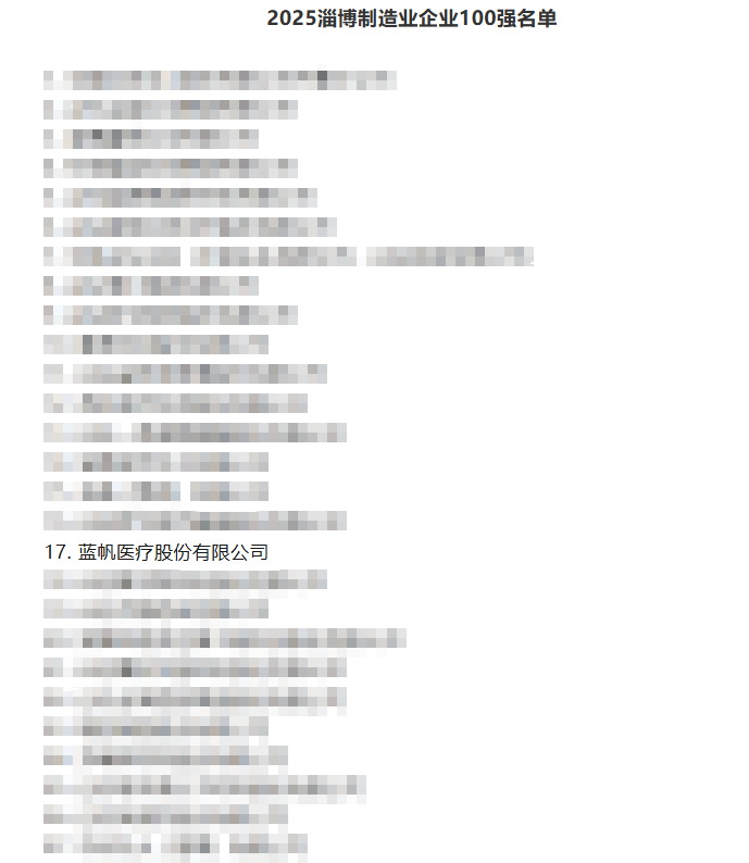 近日,淄博市工业和信息化局、市发展改革委、市企业联合会联合发布了“2025淄博企业100强”和“2025淄博制造业企业100强”榜单。蓝帆医疗凭借领先的营收体量、卓越的创新实力、深厚的制造底蕴,成功跻身两大榜单,展示了公司在淄博经济发展和转型升级中,正以实际行动贡献自己的力量。