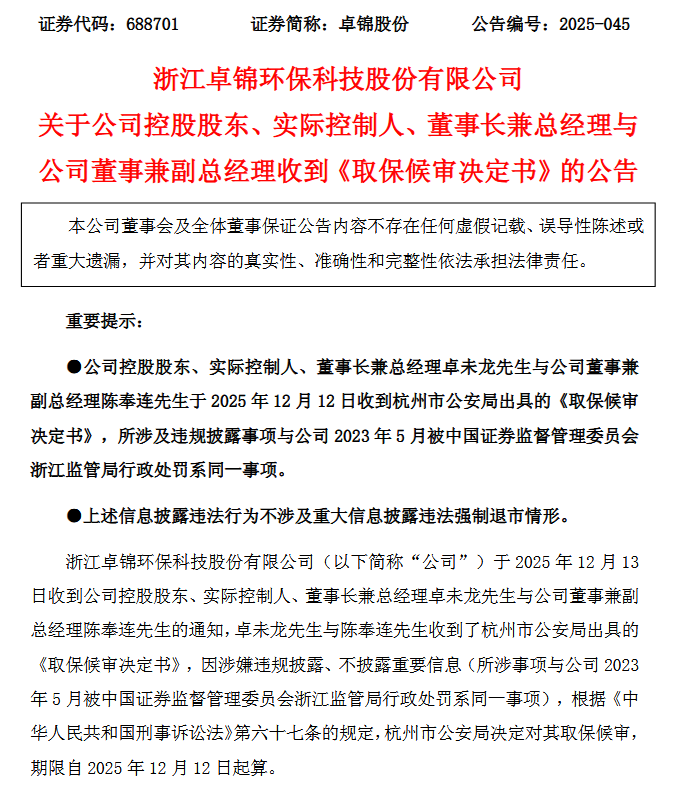 12月15日,卓锦股份(维权)公告,公司控股股东、实际控制人、董事长兼总经理卓未龙与公司董事兼副总经理陈奉连于2025年12月12日收到杭州市公安局出具的《取保候审决定书》,所涉及违规披露事项与公司2023年5月被中国证券监督管理委员会浙江监管局行政处罚系同一事项。上述信息披露违法行为不涉及重大信息披露违法强制退市情形。
