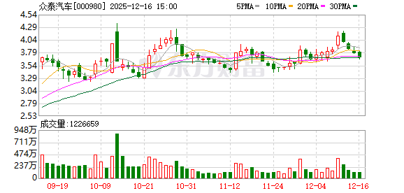 众泰汽车12月16日大宗交易平台出现一笔成交,成交量428.69万股,成交金额1581.87万元,大宗交易成交价为3.69元。该笔交易的买方营业部为中国中金财富证券有限公司上海黄浦区中山东二路证券营业部,卖方营业部为国泰海通证券股份有限公司北京方庄路证券营业部。