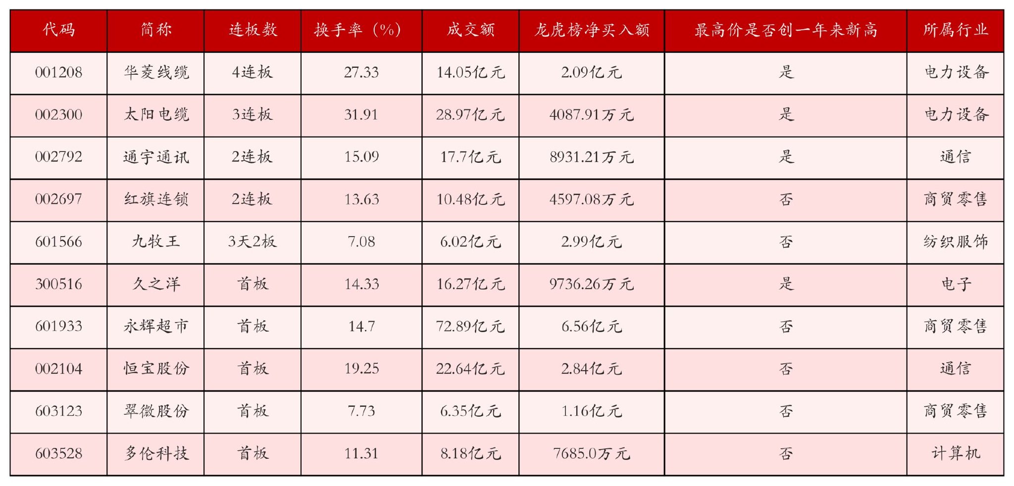 截至12月16日收盘,上证综指下跌1.11%,收于3824.81点,深证成指下跌1.51%,收于12914.67点,创业板指下跌2.1%,收于3071.76点。今日沪深两市A股共计44只涨停,综合当前连板数以及当日龙虎榜数据,其中较为强势的前三只个股分别为:华菱线缆(001208)、太阳电缆(002300)与通宇通讯(002792)。今日强势个股前10位具体数据见下表: