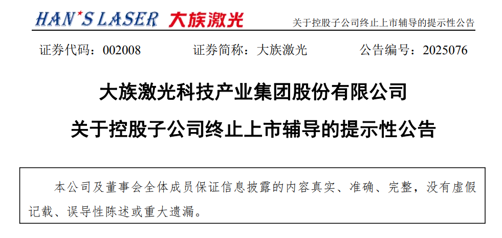 上海大族富创得科技股份有限公司于近日终止上市辅导事项!