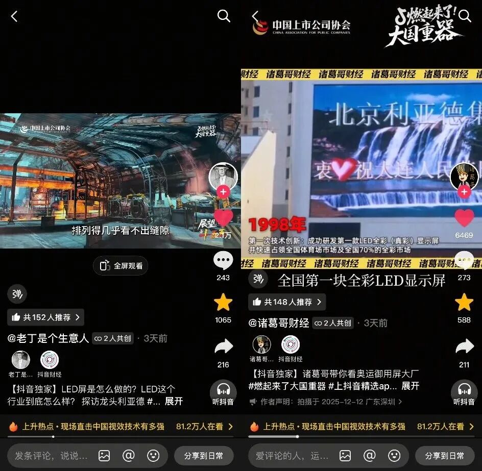 近期,中国上市公司协会联合抖音财经,邀请多位抖音顶流创作者组团走进利亚德,以沉浸式探访解锁大国重器的 “硬核密码”!截至目前,探访内容在抖音平台播放量500万+,相关话题 # # 实时在看人数突破160万,引发广泛关注和热烈讨论。