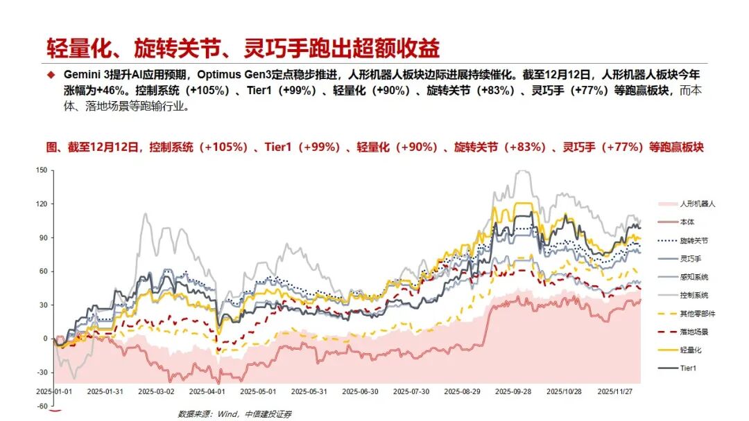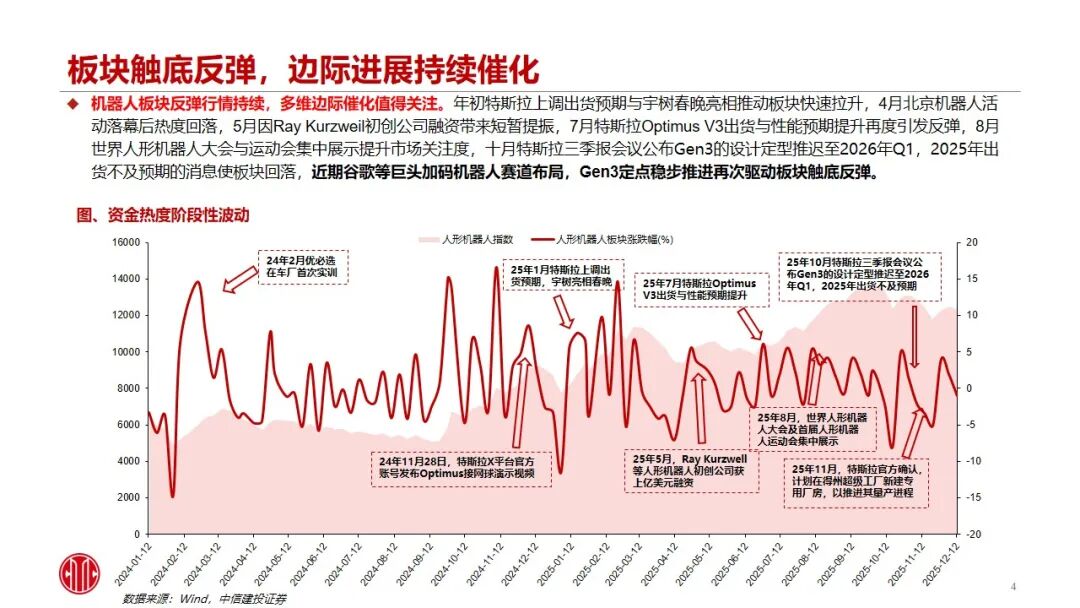 行情复盘:本周板块调整震荡,谷歌加码机器人布局、特斯拉Gen3定点推进、国内龙头订单交付等带来边际催化。以人形机器人产业链标的高比例配置的永赢先进制造智选A基金为例,最新净值2.21,本周-1.26%,近一月+4.13%,近三个月-3.88%;12.8-12.12单日涨跌幅分别约+1.27%、-0.95%、+1.07%、-1.94%、-0.67%。周涨幅居前个股包括:华培动力+17.56%、速腾聚创+11.93%、领益智造+6.01%、东睦股份+5.60%、华工科技+4.41%。机器人板块行情在经历明显回调后,在边际催化下迎来触底反弹,谷歌等巨头纷纷布局,首批科创创业机器人ETF集体上报,后续Gen3定点、审厂结果与产业链认证进展等事件催化值得重点关注,底部建议聚焦优质环节,把握确定性和灵巧手等核心变化。