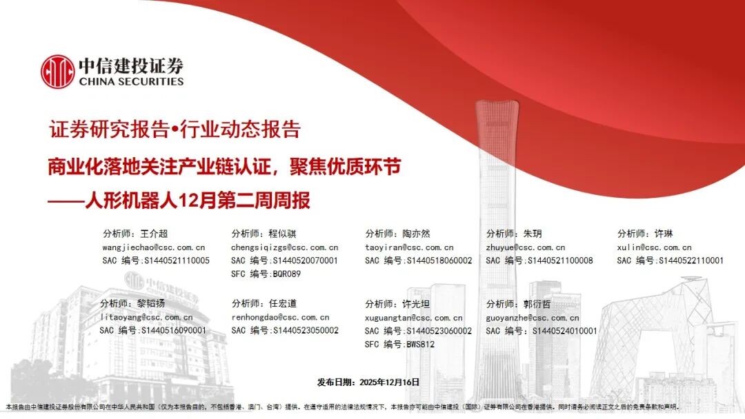 证券研究报告名称:《商业化落地关注产业链认证,聚焦优质环节——人形机器人12月第二周周报》
