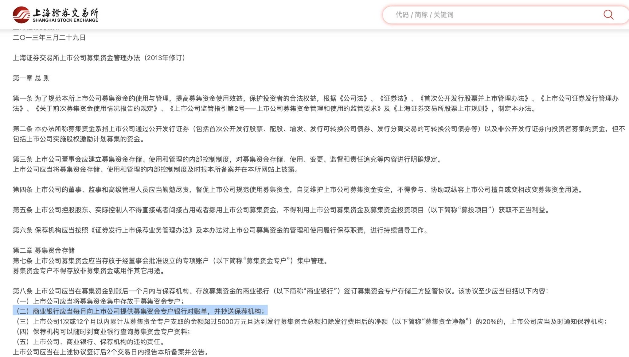 该律师提到的“商业银行需要每月向上市公司提供募集资金专户的银行对账单”为根据监管规定确认的标准化实际操作,上交所早在2013年发布的《上海证券交易所上市公司募集资金管理办法(2013年修订)》就已提到该点。