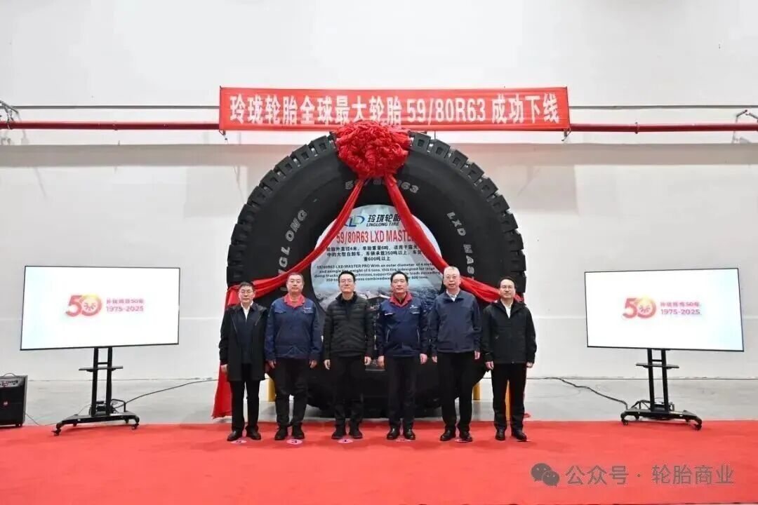 59/80R63的下线,标志着玲珑正式跻身全球少数能够生产63吋全钢巨胎的企业行列。该轮胎直径超过4米,单胎重量逾6吨,是目前全球尺寸最大的轮胎产品,主要配套于大型露天矿用自卸车,满足矿区复杂多变、高强度使用的严苛环境使用条件。