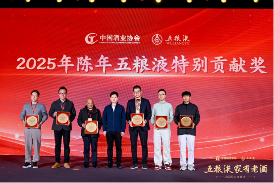 特别设置的“2025年陈年五粮液特别贡献奖”颁奖仪式上,五粮液股份公司副总经理王源培为张凯、陈连茂等6位在陈年五粮液文化传播与市场推广中作出突出贡献的个人颁奖,致敬行业推动者。