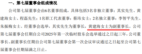 公告显示,经董事会选举,公司副总经理、财务总监、董事会秘书黄建海上任副董事长,任期为三年。