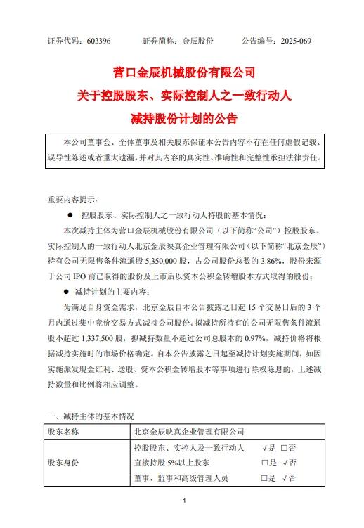 12月12日,金辰股份(603396)发布关于控股股东、实际控制人之一致行动人减持股份计划的公告。