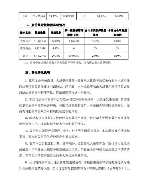 另外,大晟资产本次轮候冻结股份数量1,780,597股,本次轮候冻结中的1,770,638股前期已质押于中国工商银行股份有限公司深圳福田支行。