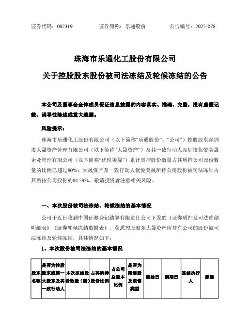12月12日,乐通股份(002319)公告称,公司于近日收到中国证券登记结算有限责任公司下发的《证券质押及司法冻结明细表》《证券轮候冻结数据表》,获悉控股股东大晟资产所持有公司的股份被司法冻结及轮候冻结。