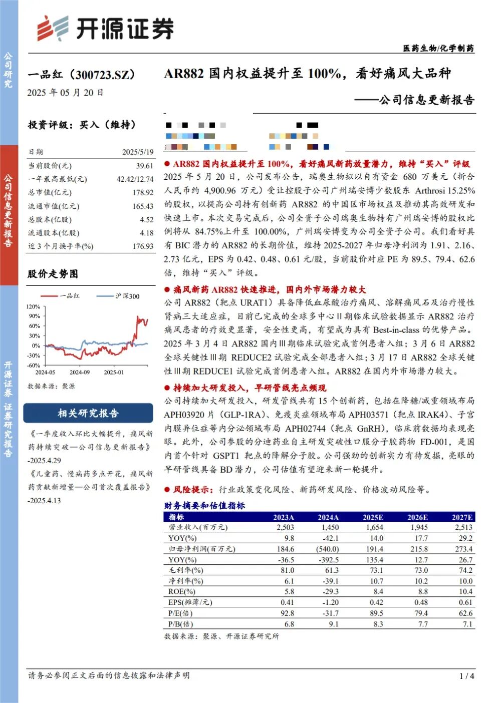 一品红的参股公司Arthrosi将被Sobi美国以最高15亿美元(首付款9.5亿美元+最高5.5亿美元里程碑款)收购。交易后,一品红将保留AR882痛风药在中国地区(含港澳台)100%的权益,并获得该药的全球生产供应优先权,预计此安排优于按持股比例分成的回报。