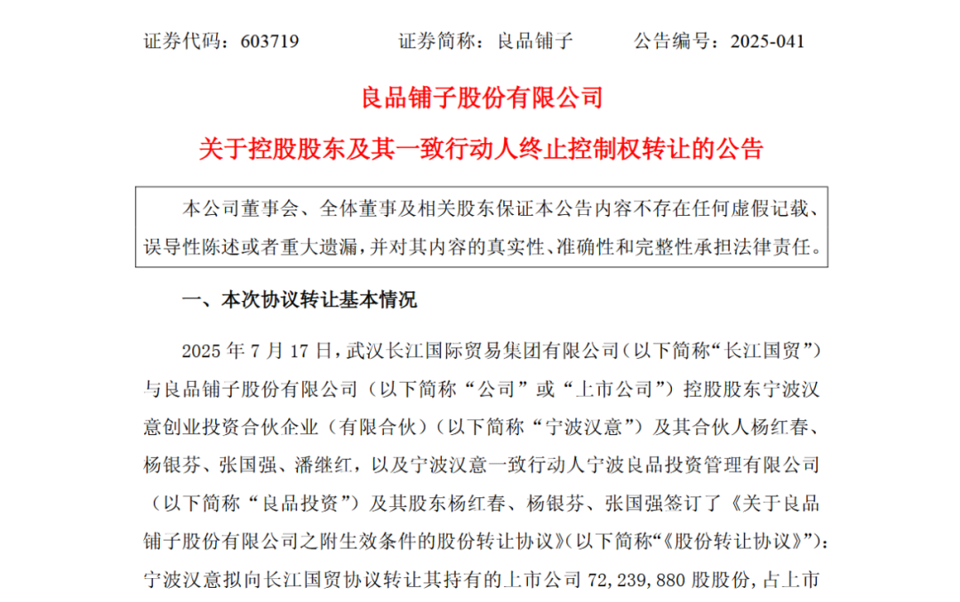 7月17日,良品铺子控股股东宁波汉意及其一致行动人宁波良品分别与长江国贸签署《股份转让协议》。宁波汉意及一致行动人宁波良品投资管理有限公司,拟向武汉长江国际贸易集团有限公司转让合计 21% 的公司股份,交易总价约 10.46 亿元。交易完成后,长江国贸将成为良品铺子的控股股东,武汉市人民政府国有资产监督管理委员会将成为公司实际控制人。