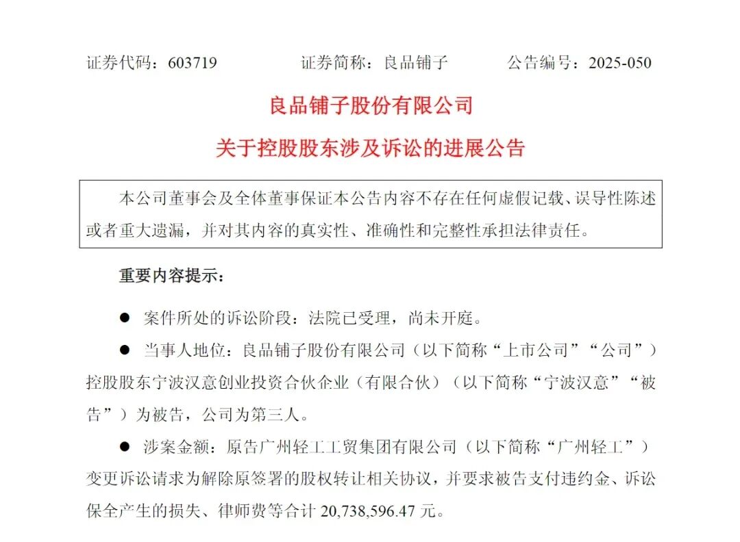 广州轻工起诉良品铺子控股股东,股权纠纷涉案金额已涨超10亿元-21世纪经济报道