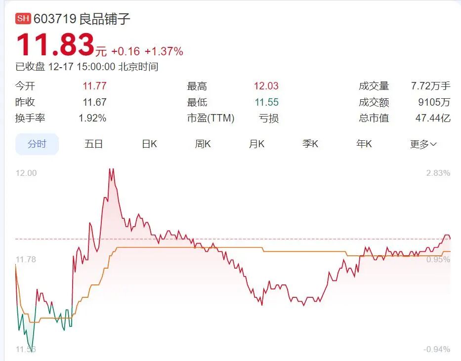 上市初期,顶着“高端零食第一股”的光环、不俗的产品竞争力催生的良好口碑及稳健增长的业绩,其股价曾一度超过 80 元 / 股,市值最高超过 300 亿元。截至12月17日收盘,良品铺子报收11.83元,上涨1.37%,总市值约47.44亿元,较巅峰时期蒸发逾八成。