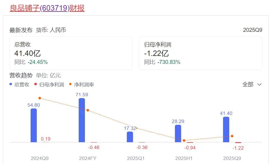 2025年前三季度,良品铺子实现营收41.4亿元,同比下滑24.45%,归母净利润为-1.22亿元 ,同比暴跌730.83%,由盈转亏,良品铺子曾表示,利润的大幅下滑主要系公司淘汰低效门店、同时线上渠道流量费上升所致。