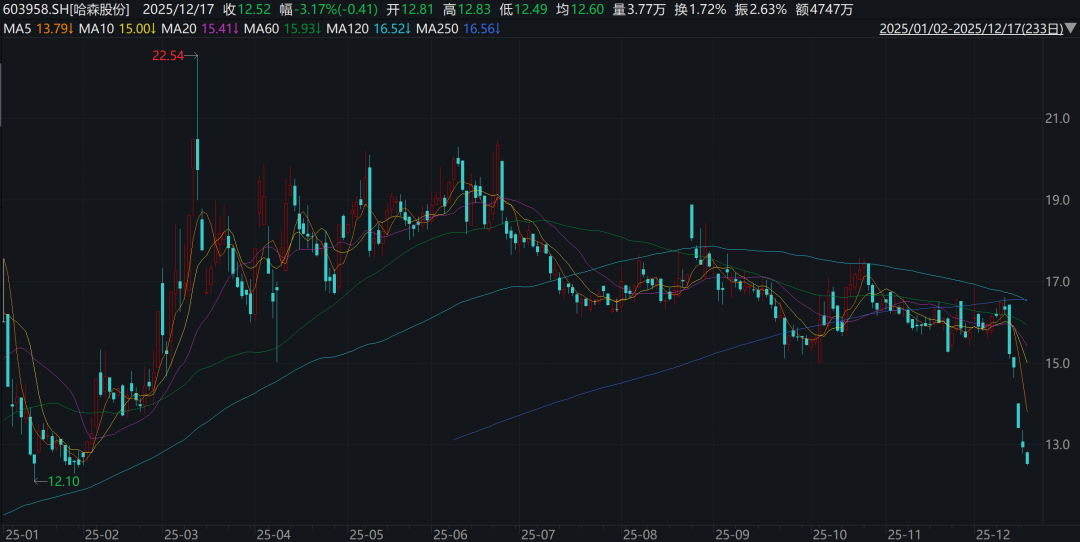 公告发布后,哈森股份股价连续下挫,截至12月17日午盘收于12.52元/股,最近三天跌幅近16%。