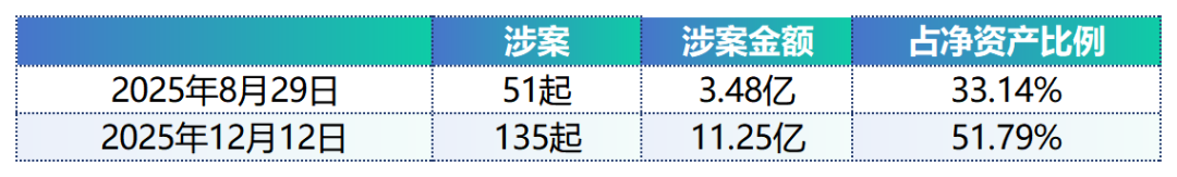 然而,仅仅4个月不到,仕净科技的累计诉讼仲裁呈现“量级式”增长:累计案件数激增至135起,4个月新增84起,增幅高达165%;涉案总金额达到11.25亿元,增幅达223%;其中未结诉讼金额5.44亿元,占净资产比例跃升至51.79%。