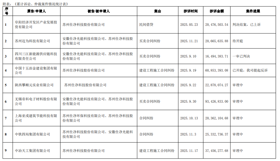 2025年8月29日,仕净科技首次披露的累计诉讼仲裁公告显示,过去十二个月内公司及控股子公司涉案51起,累计诉讼、仲裁事项涉案金额约3.48亿元,占最近一期经审计净资产绝对值的33.14%。