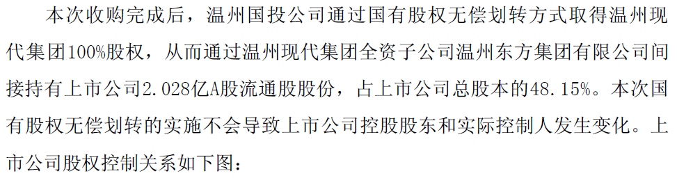 划转前,温州市国资委通过温州现代集团全资子公司温州东方集团间接持有上市公司48.15%的股份。划转后,温州国投公司作为新加入的中间层,成为温州现代集团的100%控股股东。