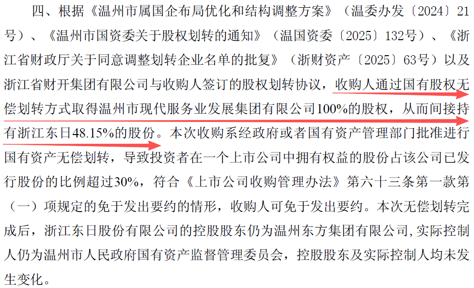 根据浙江东日发布的收购报告书摘要,温州市国有资本投资运营有限公司通过国有股权无偿划转方式,获得温州市现代服务业发展集团有限公司100%股权。