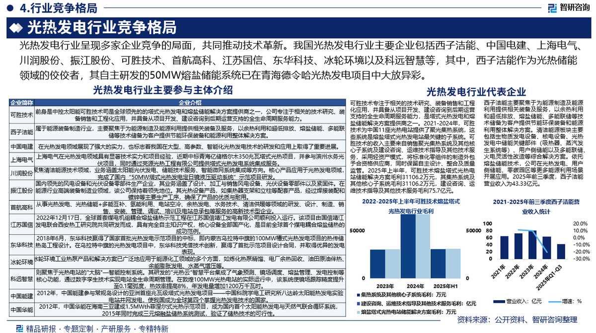 竞争情况:光热发电行业呈现多家企业竞争的局面,,共同推动技术革新。我国光热发电行业主要企业包括西子洁能、中国电建、上海电气、川润股份、振江股份、可胜技术、首航高科、江苏国信、东华科技、冰轮环境以及科远智慧等,其中,西子洁能作为光热储能领域的佼佼者,其自主研发的50MW熔盐储能系统已在青海德令哈光热发电项目中大放异彩。
