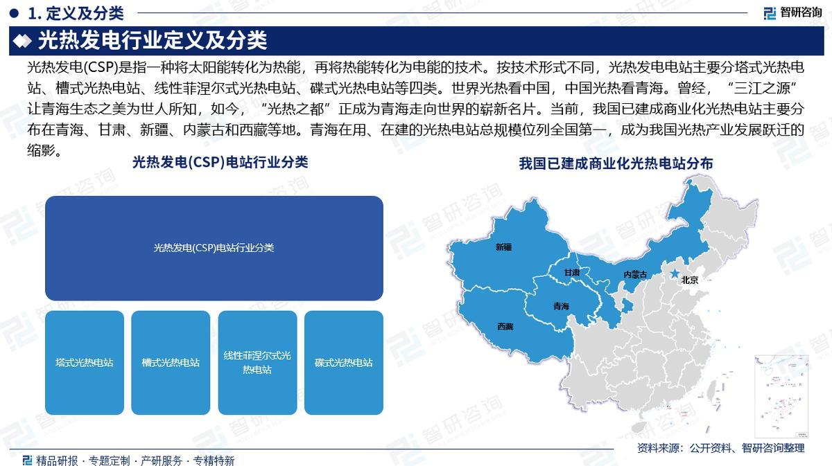 行业定义及分类:光热发电(CSP)是指一种将太阳能转化为热能,再将热能转化为电能的技术。按技术形式不同,光热发电电站主要分塔式光热电站、槽式光热电站、线性菲涅尔式光热电站、碟式光热电站等四类。