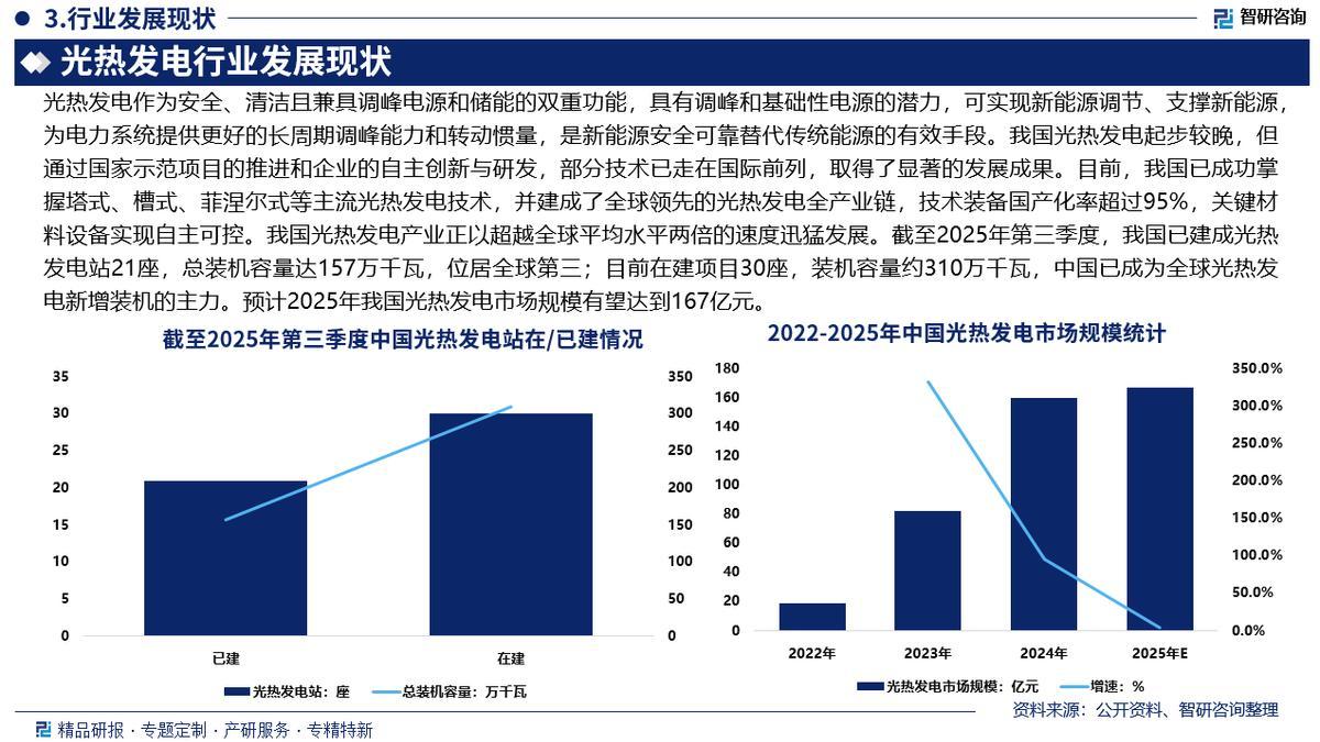 光热发电作为安全、清洁且兼具调峰电源和储能的双重功能,具有调峰和基础性电源的潜力,可实现新能源调节、支撑新能源,为电力系统提供更好的长周期调峰能力和转动惯量,是新能源安全可靠替代传统能源的有效手段。我国光热发电起步较晚,但通过国家示范项目的推进和企业的自主创新与研发,部分技术已走在国际前列,取得了显著的发展成果。目前,我国已成功掌握塔式、槽式、菲涅尔式等主流光热发电技术,并建成了全球领先的光热发电全产业链,技术装备国产化率超过95%,关键材料设备实现自主可控。我国光热发电产业正以超越全球平均水平两倍的速度迅猛发展。截至2025年第三季度,我国已建成光热发电站21座,总装机容量达157万千瓦,位居全球第三;目前在建项目30座,装机容量约310万千瓦,中国已成为全球光热发电新增装机的主力。预计2025年我国光热发电市场规模有望达到167亿元。