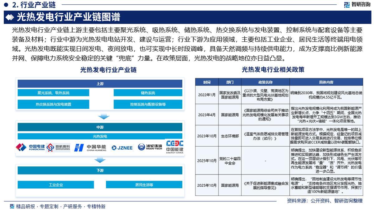 产业链核心节点:光热发电行业产业链上游主要包括主要聚光系统、吸热系统、储热系统、热交换系统与发电装置、控制系统与配套设备等主要装备及材料;行业中游为光热发电电站开发、建设与运营;行业下游为应用领域,主要包括工业企业、居民生活等终端用电领域。