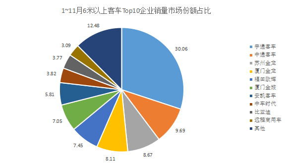 从市场份额维度来看,1~11月,6米以上客车市场Top10企业的市占率达到87.52%,较1~10月收窄了0.46个百分点。另外,本月累计市占率超过10%的企业仍然只有宇通一家,而且其仍牢牢占据市场近三分之一的份额,地位稳固。
