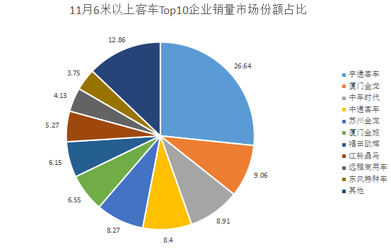 从市占率维度来看,11月,6米以上客车Top10企业市占率达到87.14%,较上月收窄了0.82个百分点,变化不大,但是呈现出持续收窄的态势。另外,本月市占率超过10%的仅有宇通一家,这一细分市场呈现出“一家独大”的格局。
