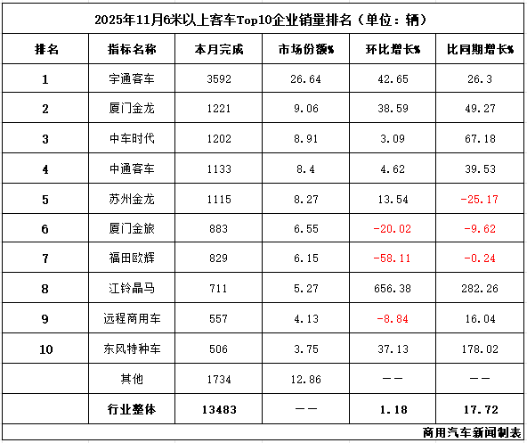 11月,6米以上客车市场乘着“金九银十”的热度,销量继续攀高!