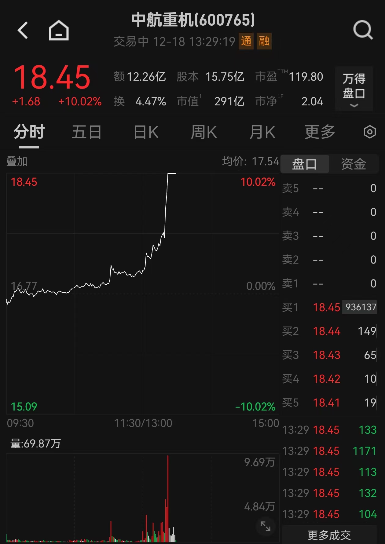 上证报中国证券网讯(记者于祥明)12月18日13点29分,中航重机异动拉升至涨停。