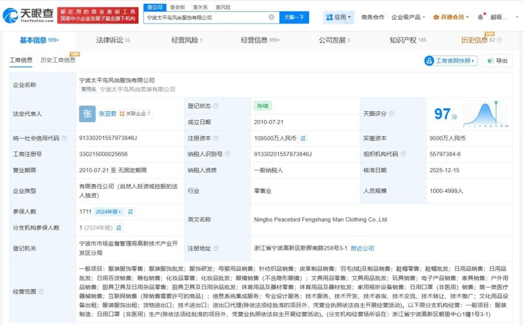 天眼查工商信息显示,近日,宁波太平鸟风尚服饰有限公司发生工商变更,注册资本由9500万人民币增至10.95亿人民币,增幅约1053%。