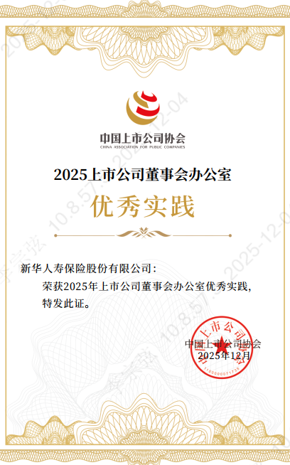 近日,新华保险(A股代码:601336,H股代码:01336)获奖频频——分别在中国上市公司协会、财联社等主办的评选中荣获“上市公司董事会办公室优秀实践”“上市公司2024年报业绩说明会优秀实践”和“最佳市值管理董秘”三项殊荣,公司高质量发展与价值增长成果以及公司治理、信息披露和投资者关系管理工作获得市场充分肯定。