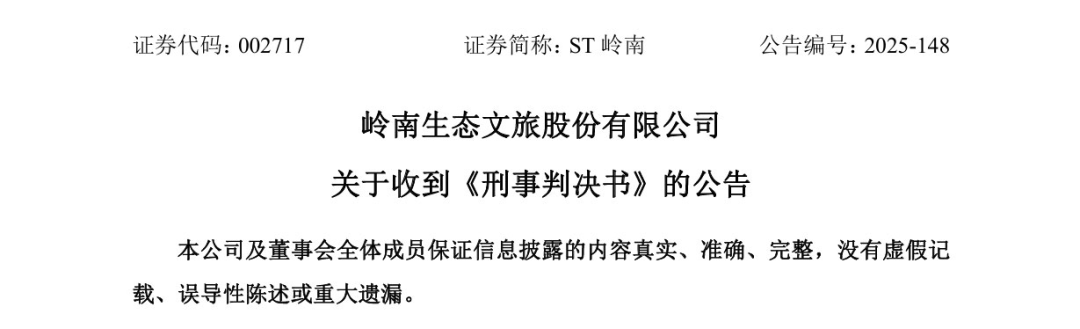 12月16日晚间,岭南生态文旅股份有限公司(下称“岭南股份”)发布公告称,公司收到河南省汤阴县人民法院出具的《刑事判决书》((2025)豫0523刑初 223 号),公司犯串通投标罪,判处罚金人民币60万元,两名被告人分别被判处有期徒刑十个月和十个月。