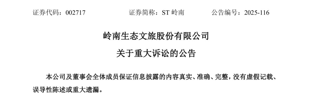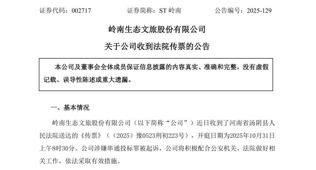 11月4日晚,岭南生态文旅股份有限公司(下称“岭南股份”)发布公告称,公司因涉嫌串通投标罪被起诉,最近收到法院传票。