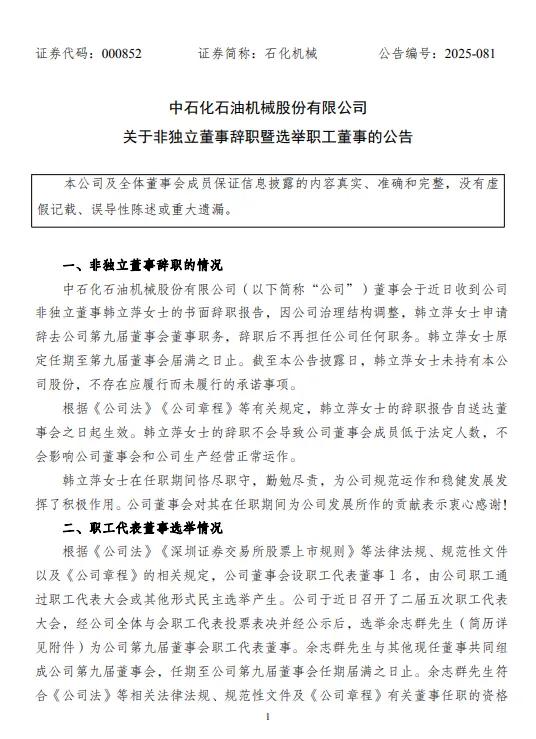 12月17日,石化机械(000852)公告称,公司董事会于近日收到公司非独立董事韩立萍女士的书面辞职报告,因公司治理结构调整,韩立萍女士申请辞去公司第九届董事会董事职务,辞职后不再担任公司任何职务。韩立萍女士原定任期至第九届董事会届满之日止。截至本公告披露日,韩立萍女士未持有本公司股份,不存在应履行而未履行的承诺事项。