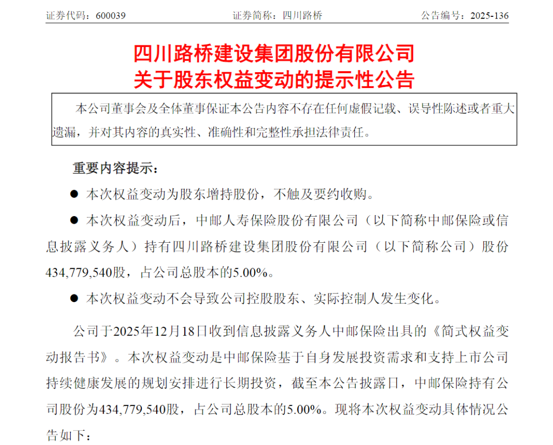 12月18日晚间,四川路桥(600039)发布公告称,中邮保险于2025年12月17日通过二级市场买入股票的方式增持公司11.43万股,占公司总股本的0.0013%。增持后,中邮保险持有四川路桥4.35亿股,占公司总股本的5.00%。此次权益变动不触及要约收购,且不会导致公司控股股东、实际控制人发生变化。