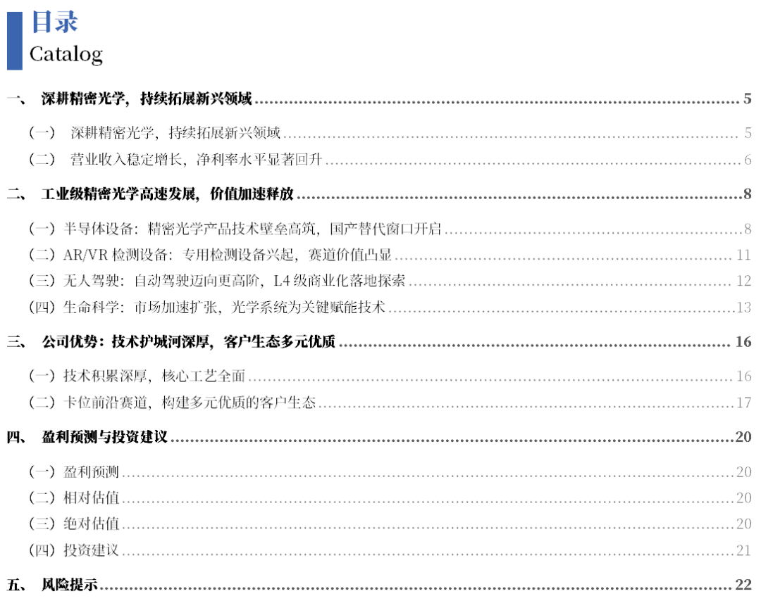 工业级精密光学高速发展,价值加速释放:近年来在半导体设备等多个应用领域快速发展的驱动下,工业级精密光学在精密光学中逐步占据主导地位。1)半导体设备:工业级精密光学产品在半导体领域主要应用于使用到光学系统的半导体设备中。虽然面临严峻的技术挑战和外部限制,但巨大的国产替代市场和国家层面的战略支持也是国内光学元件厂商难得的发展机遇。2)AR/VR检测设备:目前AR/VR检测设备市场已初具规模,展望未来,AR/VR检测设备市场的发展将受终端市场爆发、产品质量要求提升和技术迭代三重因素推动。3)无人驾驶:目前,L4级无人驾驶已经告别了早期的实验室研发和Demo阶段,进入了实实在在的商业化落地探索期。随着自动驾驶向更高阶推进,对激光雷达的单车搭载量和性能要求也在同步提升。4)生命科学:基因测序与口腔扫描仪市场的扩张也将拉动对显微成像系统等光学产品的需求。