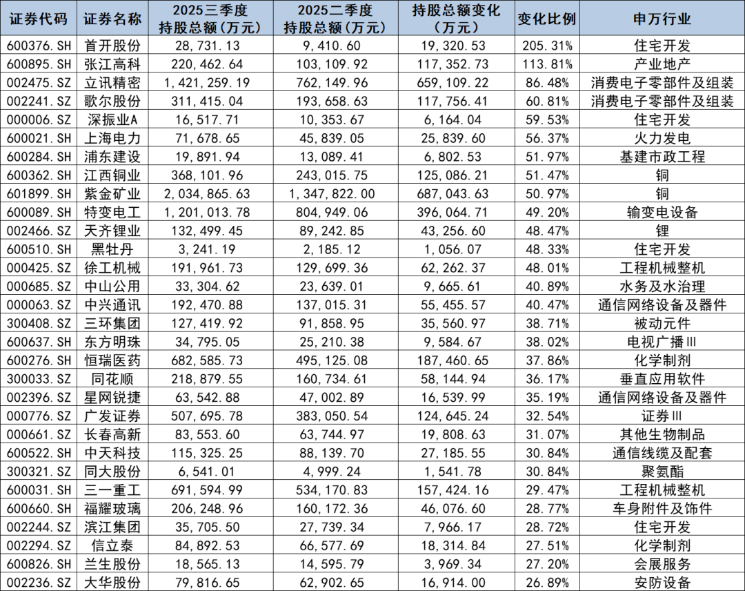 首开股份(600376.SH) 以205.31% 的持股变化比例稳居榜首,持股总额从二季度的 9310.60 万元增至 28731.13 万元,新增近 2 亿元,是本季度增长最猛的个股;