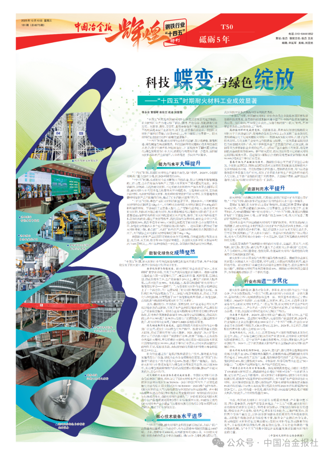 “十四五”时期是我国耐火材料行业高质量发展的起步阶段。耐火材料行业有力地支撑了钢铁、建材、有色冶金、新能源等行业发展。从数量、质量、交货期、服役寿命等多个维度,耐火材料行业不断地满足高温工业新技术、新工艺、新装备的新要求。我国耐火材料产量和消费量占全球60%以上,出口量稳居世界第一。耐火材料行业在国民经济中的地位显著提升。
