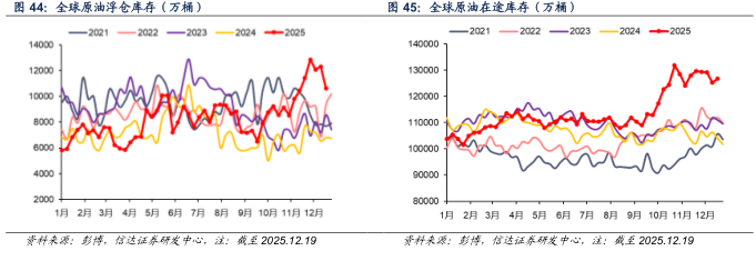 截至2025年12月19日当周,全球原油水上库存(包括在途和浮仓)为13.74亿桶,较上周-93.4万桶(-0.07%)。其中,全球原油浮仓库存为10627.8万桶,较上周-1693.4万桶(-15.93%);全球原油在途库存为12.68亿桶,较上周+1600万桶(+1.26%)。