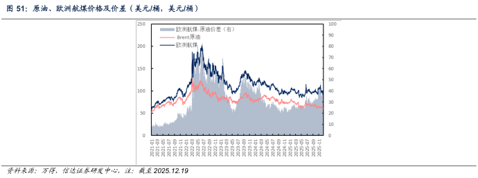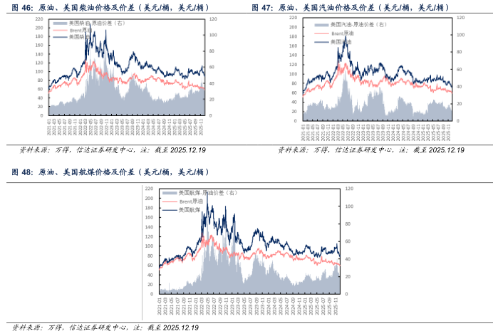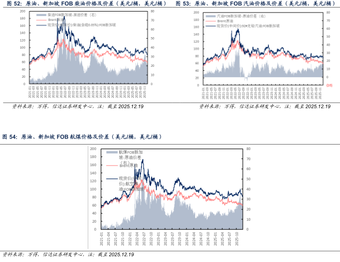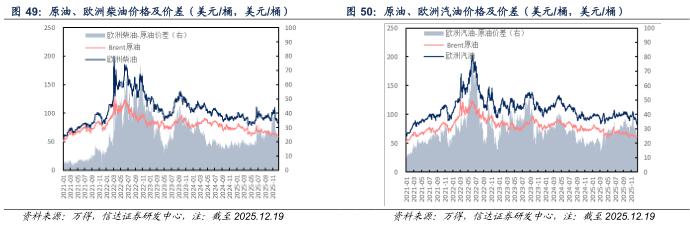 欧洲市场:截至2025年12月19日当周,欧洲柴油、汽油、航煤周均价分别为82.89(-4.25)、83.92(-6.16)、92.35(-5.14)美元/桶;与原油差价分别为22.81(-2.33)、23.84(-4.24)、32.27(-3.22)美元/桶。
