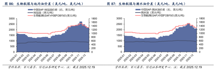 生物航煤价格及价差:截至2025年12月19日,中国生物航煤港口FOB价格为2200美元/吨,较上周五价格-100美元/吨,与地沟油、潲水油价差分别为1332.53、1270.16美元/吨,较上周五价差分别+13.08、+9.18美元/吨。欧洲生物航煤港口FOB价格为2310美元/吨,较上周五价格持平。