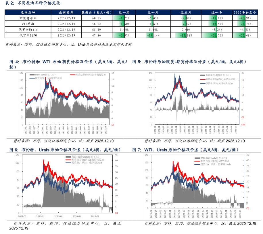 原油价格:截至2025年12月19日当周,布伦特原油期货结算价为60.05美元/桶,较上周下降1.07美元/桶(-1.75%);WTI原油期货结算价为56.52美元/桶,较上周下降0.92美元/桶(-1.60%);俄罗斯Urals原油现货价为65.49美元/桶,与上周持平;俄罗斯ESPO原油现货价为47.86美元/桶,较上周下降1.77美元/桶(-3.57%)。