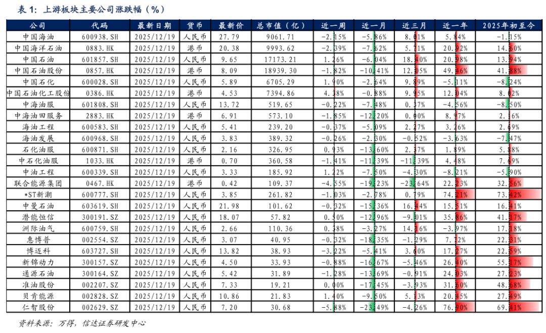 截至2025年12月19日当周,上游板块股价表现较好的是中国石油化工股份H(+4.38%)、中国石化A(+1.90%)、贝肯能源(+1.40%)。