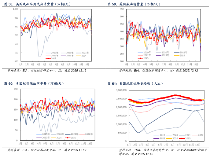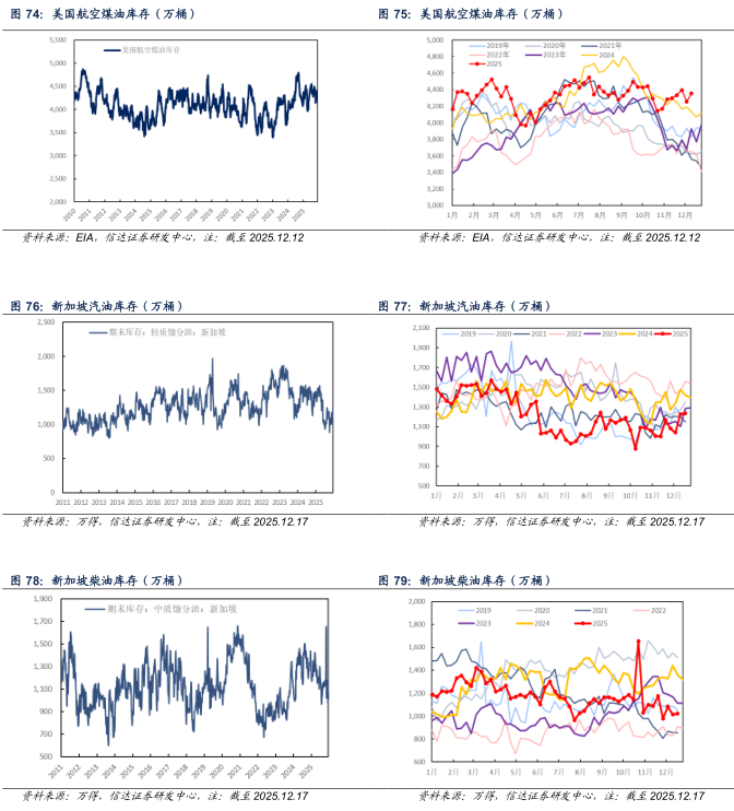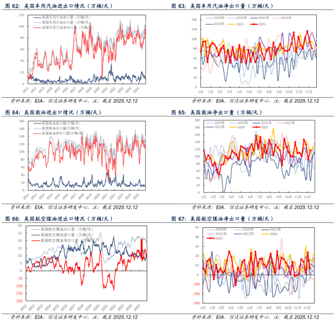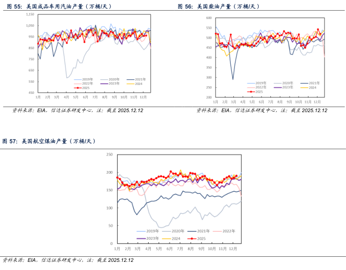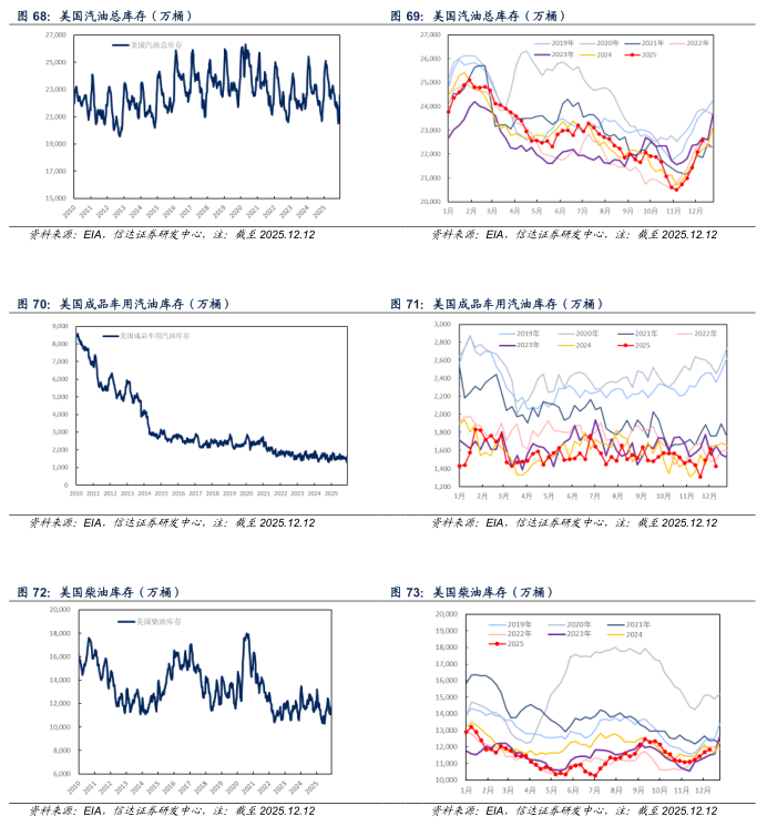 产量方面:截至2025年12月12日当周,美国成品车用汽油、柴油、航空煤油产量分别为960.9、520.3、190.4万桶/天,较上周分别+3.3(+0.34%)、-22.8(-4.20%)、+5.7(+3.09%)万桶/天。