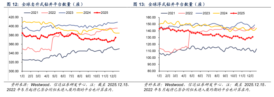 已有合同的钻井平台数量:截至2025年12月15日当周,全球海上自升式钻井平台数量为375座,较上周增加7座,其中非洲、欧洲、北美、其他地区各增加1、1、3、2座;全球海上浮式钻井平台数量为131座,较上周增加2座,其中非洲、南美各增加2、1座,东南亚减少1座。